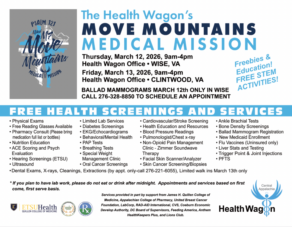 The Health Wagon visits sites in Southwest Virginia’s Buchanan, Dickenson, Lee, Russell, Scott, and Wise counties on a weekly basis.